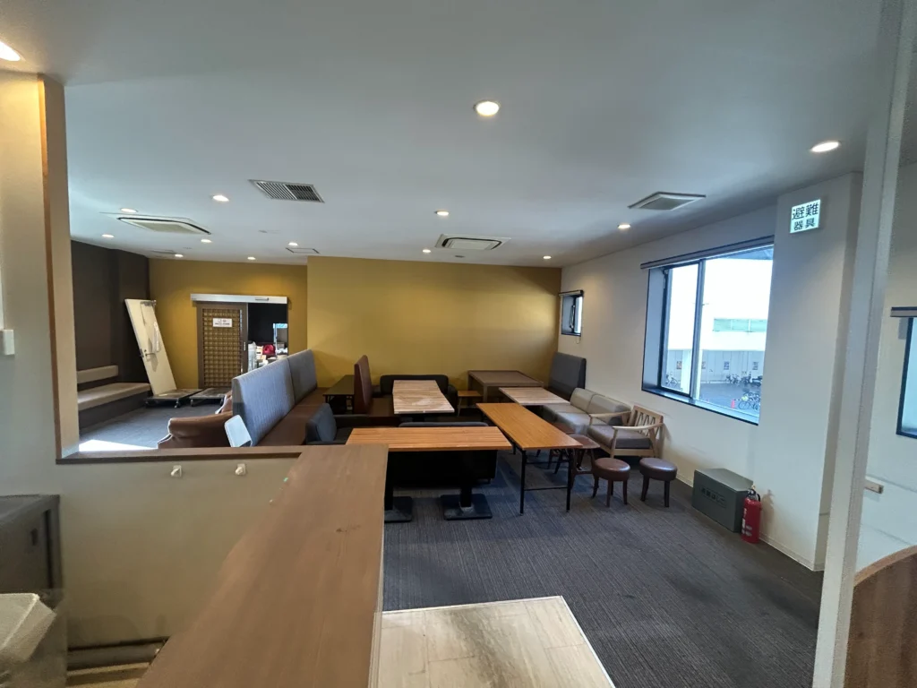既存の店舗空間から、新しい機能を加えた空間への変化です。工事前の落ち着いた木目調のラウンジから、白を基調とした明るく清潔感のある空間へと生まれ変わりました。