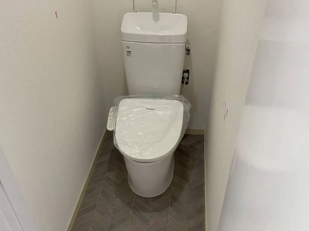 施工事例の概要|名古屋市名東区でのトイレリフォーム 名古屋市名東区のお客様宅にて、老朽化したトイレの交換工事を行いました。古い便器と床材を撤去し、新しいトイレ本体を設置。合わせて床材をヘリンボーン柄へ張替え、清潔感とデザイン性を両立した空...