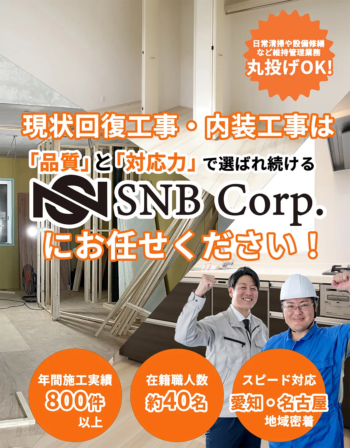SNBコーポレーションは、愛知県・岐阜県・三重県を中心に、リフォーム・内装工事・フロアコーティング・ハウスクリーニング・原状回復工事など幅広いサービスを提供しています。